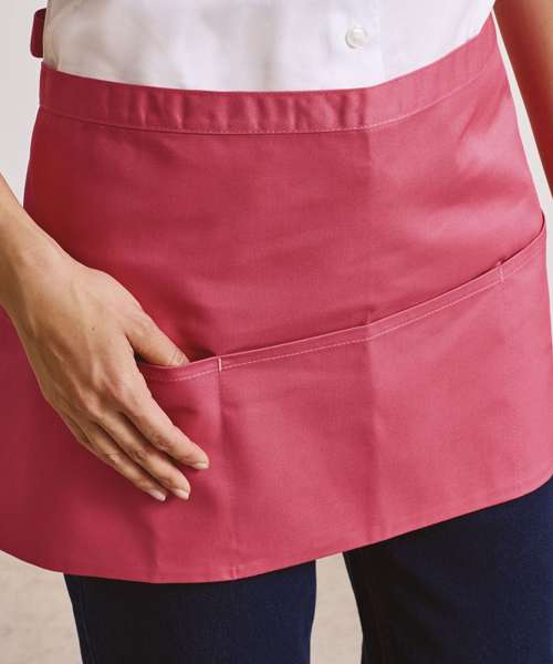 A popular style of apron seen in many bars and restaurants, this short waist apron has three open pockets. From the Premier 'Colours' collection. The pockets are great for carrying payments terminals and tablet devices.